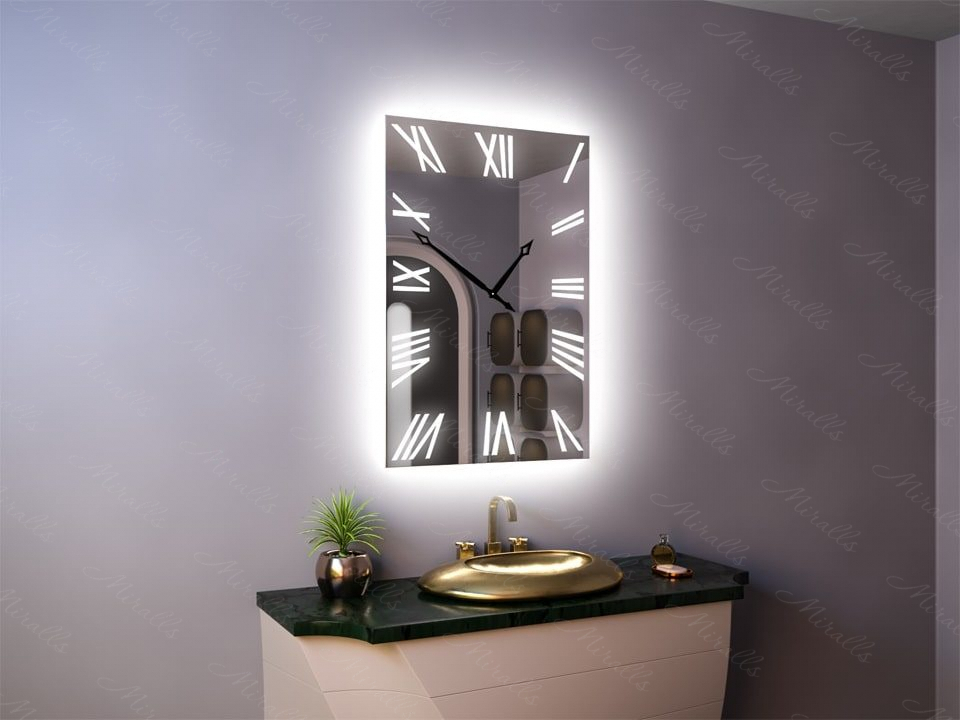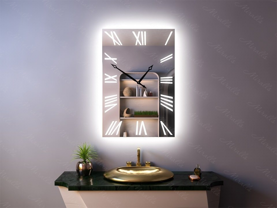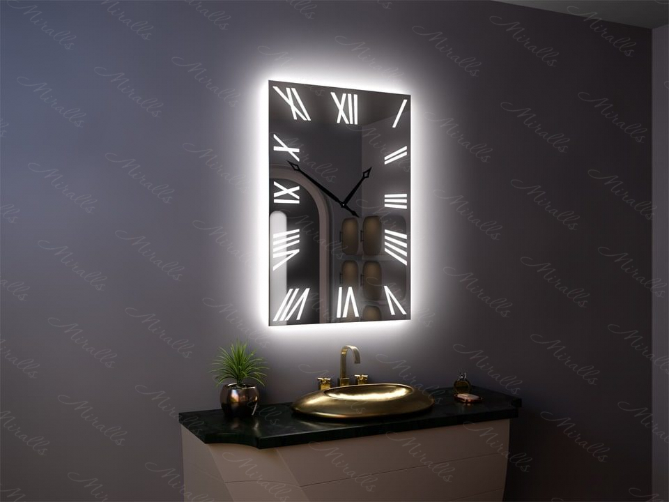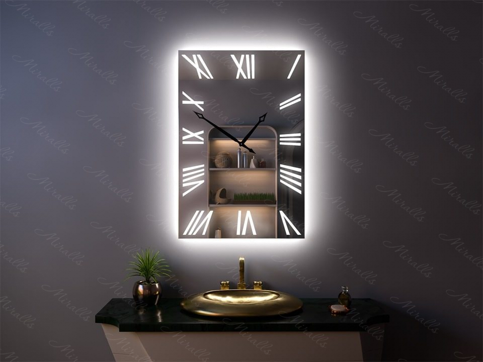 Настенное зеркало можно объединить с таким полезным устройством, как часы. Одной из таких моделей в нашем каталоге является Amara. Вы можете заказать это зеркало с подсветкой в любых нужных вам размерах – масштаб цифр будет подобран с учётом ширины и высоты изделия. На выбор предоставляется цветовая температура подсветки: холодная, нейтральная или тёплая, а также вы можете указать нужное вам расположение выключателя на корпусе.