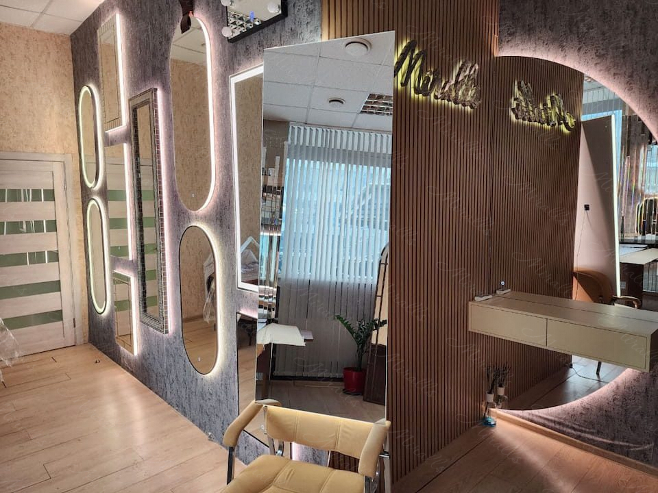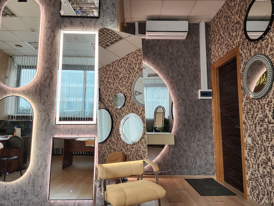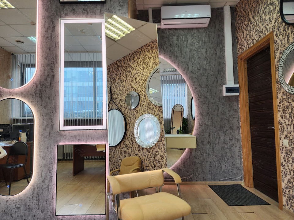 В этом зеркале используется уменьшенный корпус при увеличенном размере зеркального полотна: при взгляде на такую конструкцию создаётся впечатление, будто зеркало парит в воздухе, что особенно красиво смотрится при включённой подсветке. Рекомендуем это зеркало для помещений с рельефной плиткой или декоративной штукатуркой: с помощью интерьерной подсветки можно выгодно подчеркнуть необычную фактуру стен.