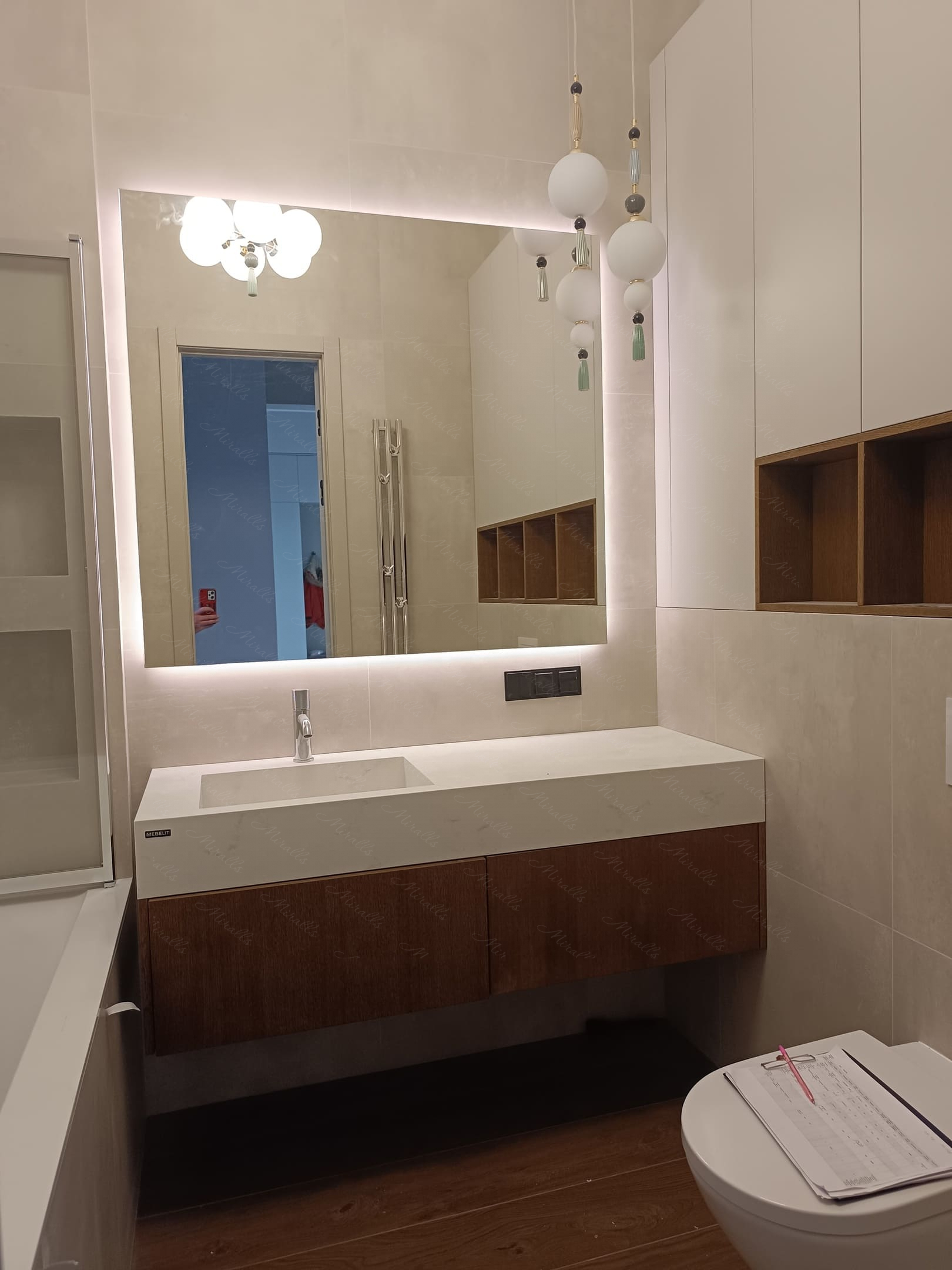 Да устанавливаем конечно же. Только для зеркала с подсветкой нужен вывод провода 220В. Если его нет то мы к зеркалу сделаем шнур для включения в розетку, либо же нужно выбрать зеркало без подсветки. У нас их тоже много.