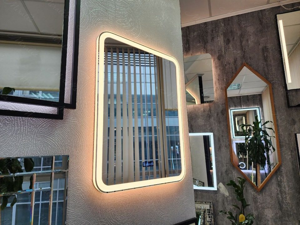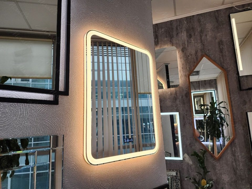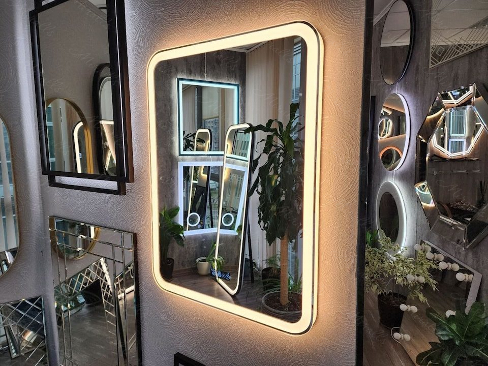 Camelia – это самое популярное из наших зеркал прямоугольной формы с закруглёнными углами. Эта модель обладает одновременно и боковой, и передней подсветкой. По периметру изделия проходит тонкий зеркальный отступ, который визуально подчёркивает красоту зеркала.