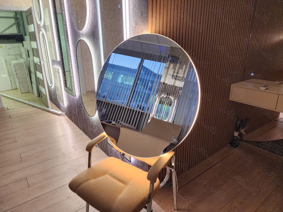 У круглого зеркала Eclipse нет фронтальной подсветки, но при этом имеется интерьерная. Она реализована путём установки светодиодной ленты внутрь корпуса изделия, который изготовлен из качественного белого пластика, пропускающего свет.