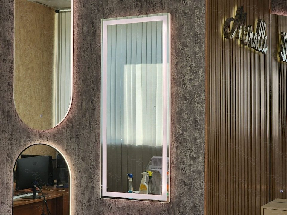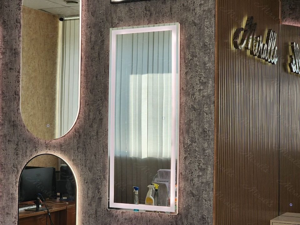 Строгое прямоугольное зеркало Edging обладает широкой линией фронтальной подсветки с небольшим отступом от края изделия.